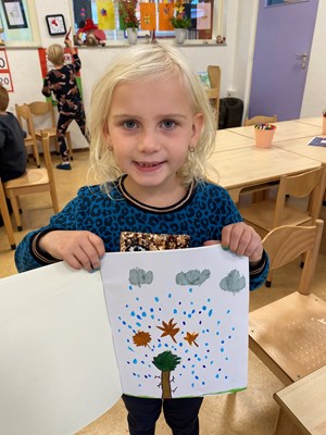 Ons nieuwe thema is hetzelfde thema als het thema van de Kinderboekenweek, giga groen. Wat hoort daar allemaal bij? Wat hoort er bij naar buiten gaan? Buiten is het nu herfst. Wij hebben alvast een mooie herfsttekening gemaakt in ons tekenschrift. Wij hebben in de klas allemaal herfst dingen neergezet en juf heeft bruine gordijnen opgehangen. Kate zei opmerkelijk: ’voor naar buitengaan in de herfst kan je beter giga bruin zingen toch juf?!’